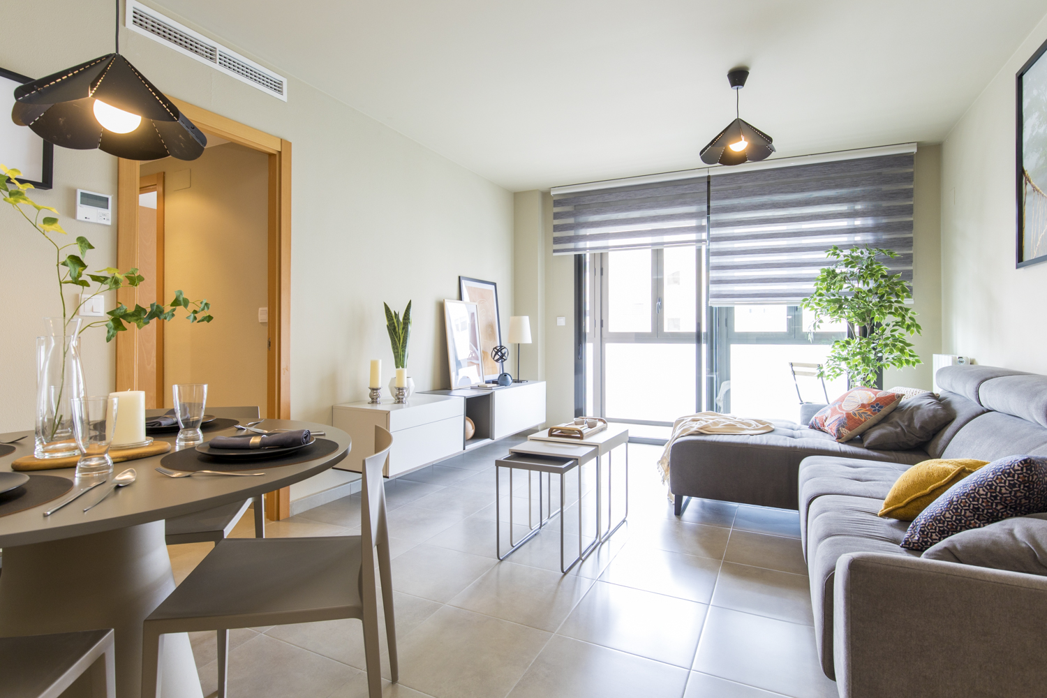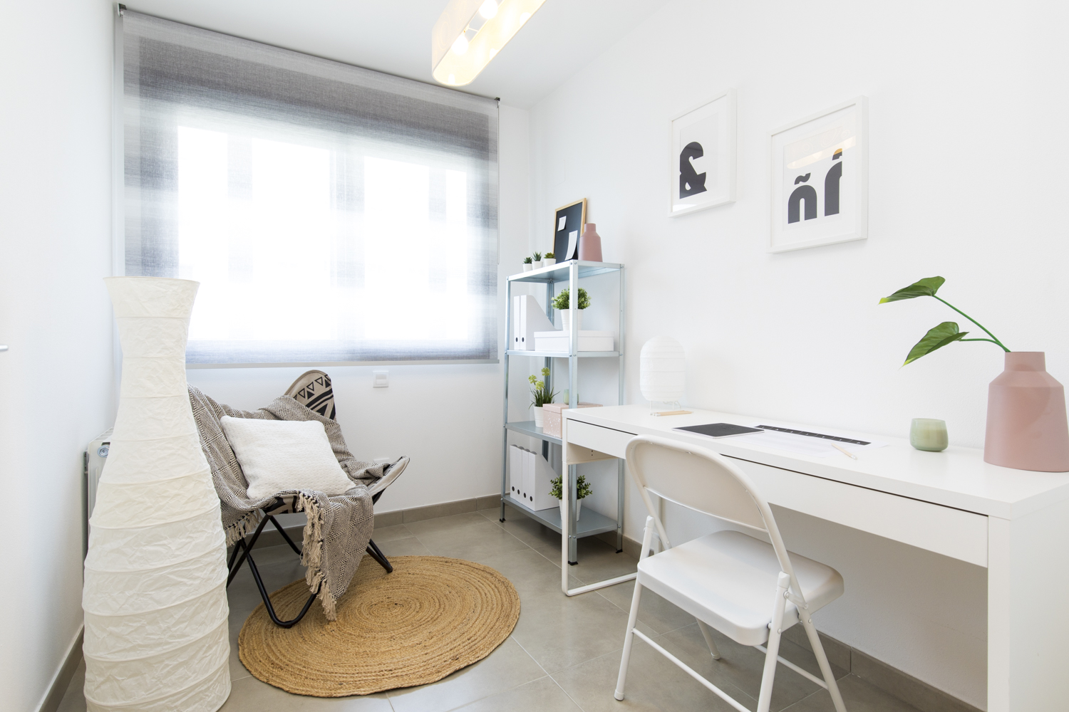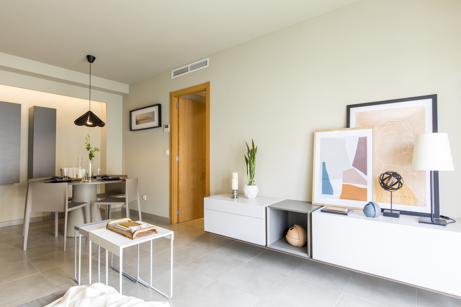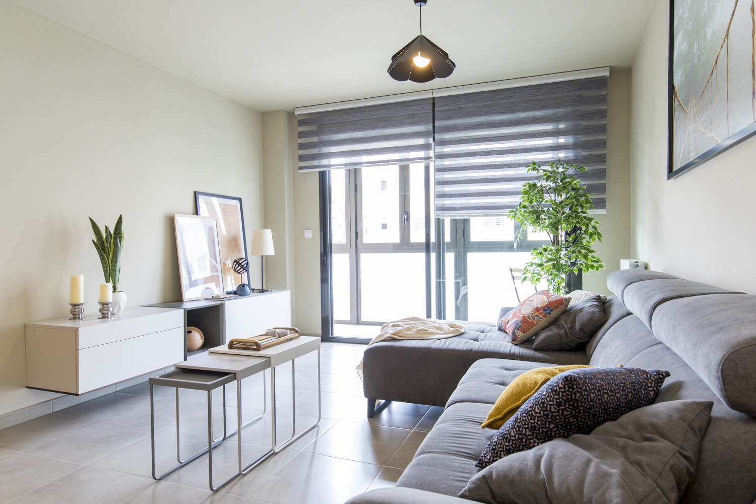 Vivienda semiamueblada en la que se plantea crear una imagen serena, pero actual, que realce el mobiliario de líneas depuradas del que consta el inmueble, complementando con material de atrezo y elementos decorativos, dando un toque acogedor para que el futuro comprador se vea viviendo allí.