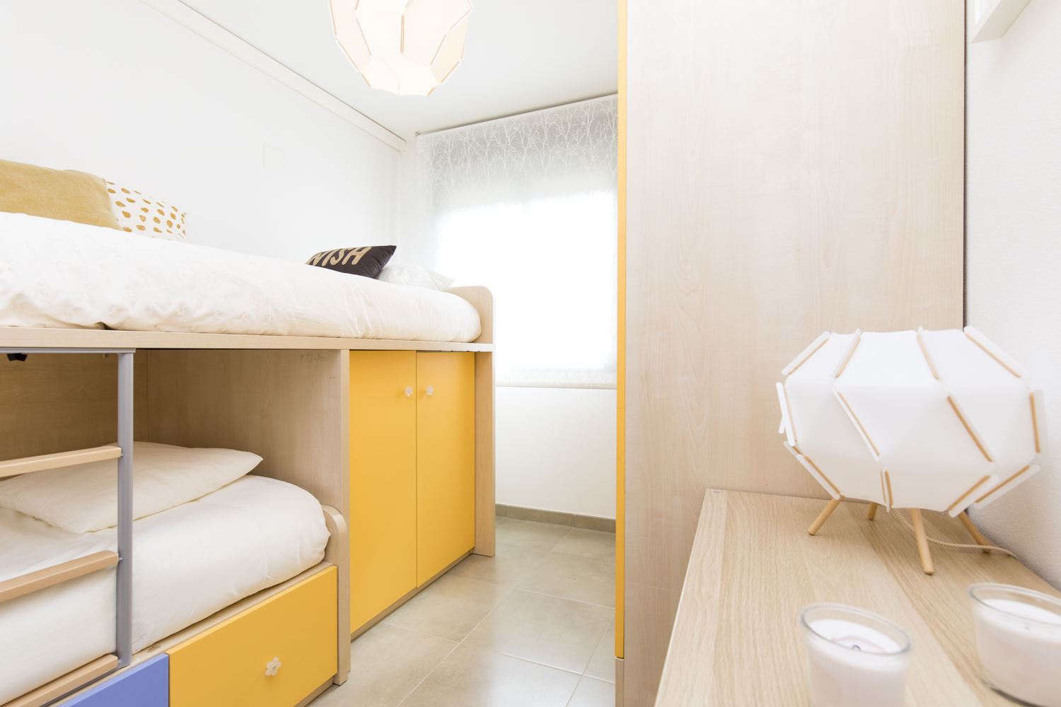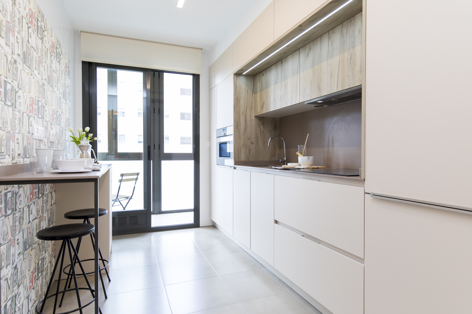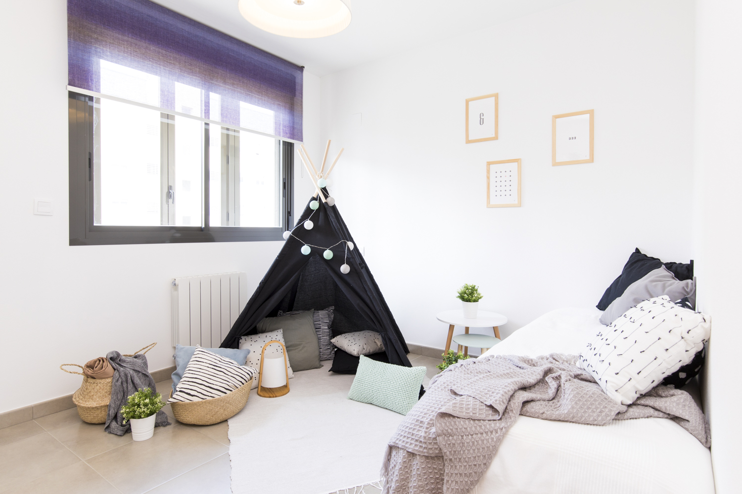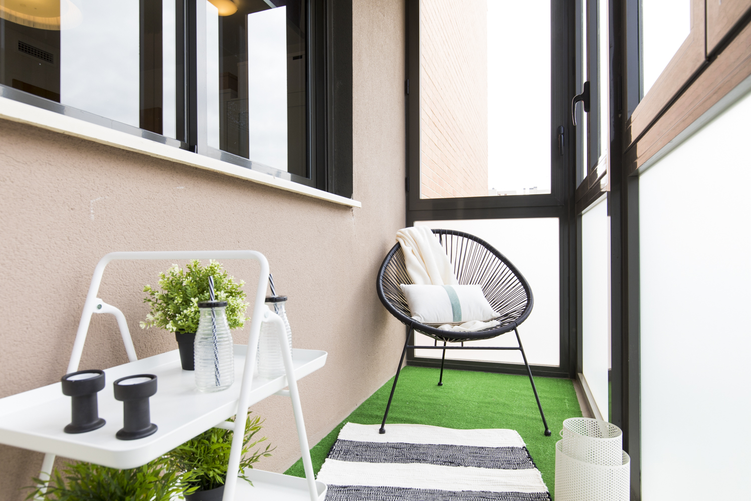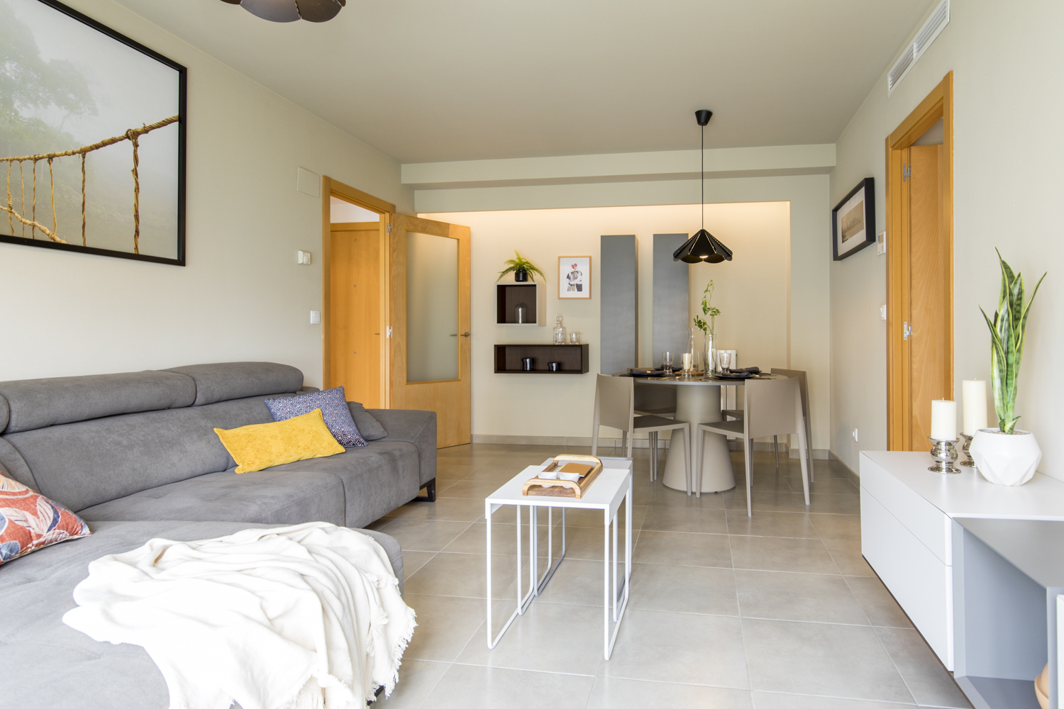 Vivienda semiamueblada en la que se plantea crear una imagen serena, pero actual, que realce el mobiliario de líneas depuradas del que consta el inmueble, complementando con material de atrezo y elementos decorativos, dando un toque acogedor para que el futuro comprador se vea viviendo allí.